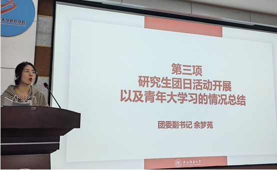 会议第三项,研究生团委副书记余梦苑对研究生团日活动的开展以及青年大学习情况进行总结分享。她表示,研究生采取分批的方式开展团日活动,确保各支部有充足的时间准备,力争让每一位团员、青年既享受乐趣、丰富生活,也能够感受到活动背后的意义,有所成长和收获。她还指出,研究生在繁重的研究任务中依然能够高效、高质完成青年大学习,值得表扬,也希望能持续坚持。