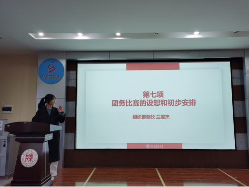 会议第七项,组织部部长兰雯杰带领大家了解了团务比赛的设想和初步安排。为深入学习贯彻习近平新时代中国特色社会主义思想,按照"党建带团建、全团大抓基层"工作要求,聚焦"基础团务更加扎实、基本活动更加固化、基层组织更有活力"的工作目标,将团组织建设目标逐一细化,扎实提升团干部工作能力。