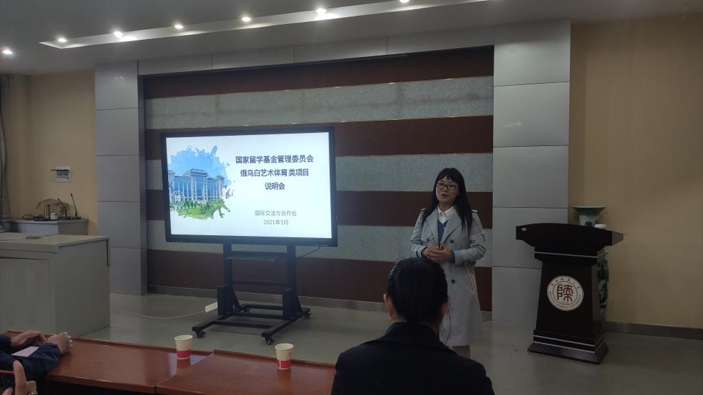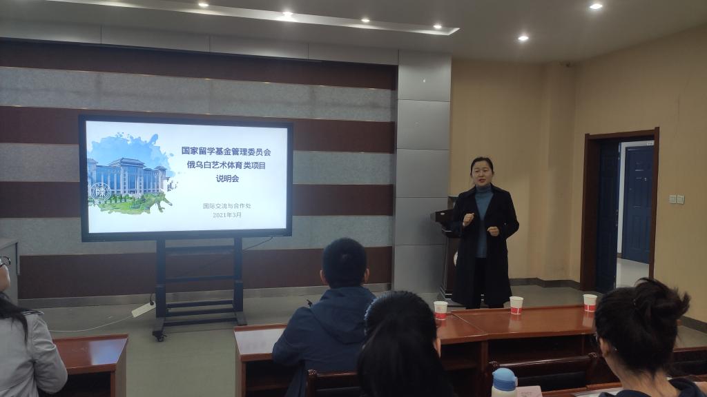 随后,国际交流处赵菁晶老师重点为同学们介绍了国家留学基金委资助俄乌白艺术体育类项目的情况,她向大家介绍了历届员工的参与情况,以及项目的申请条件、申请程序、申请材料等内容,为同学们今后的申请提供了指导和帮助,实为同学们送上了一碗满满的“干货”。
