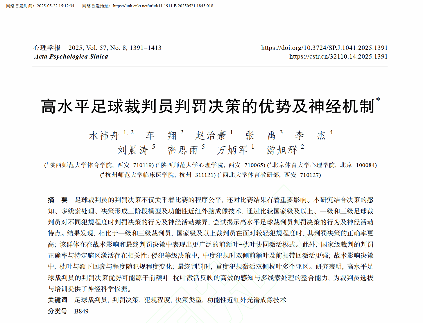 2025年5月22日,公司水祎舟副教授、万炳军教授联合心理公司游旭群教授等在国内顶级心理学学术期刊《心理学报》上网络首发题为《高水平足球裁判员判罚决策的优势及神经机制》的研究论文。公司水祎舟副教授为第一作者,游旭群教授和万炳军教授为共同通讯作者,公司为唯一署名单位。