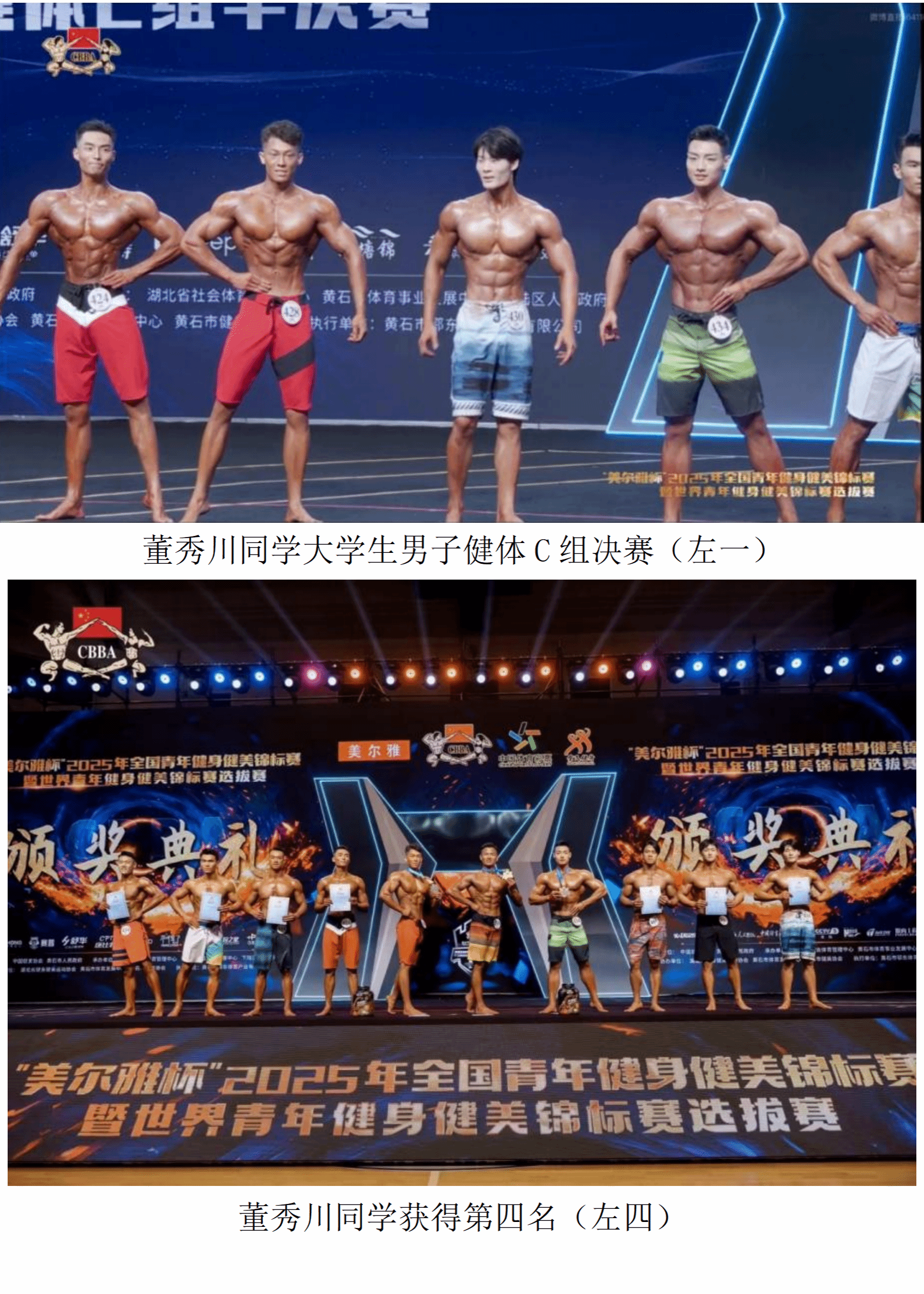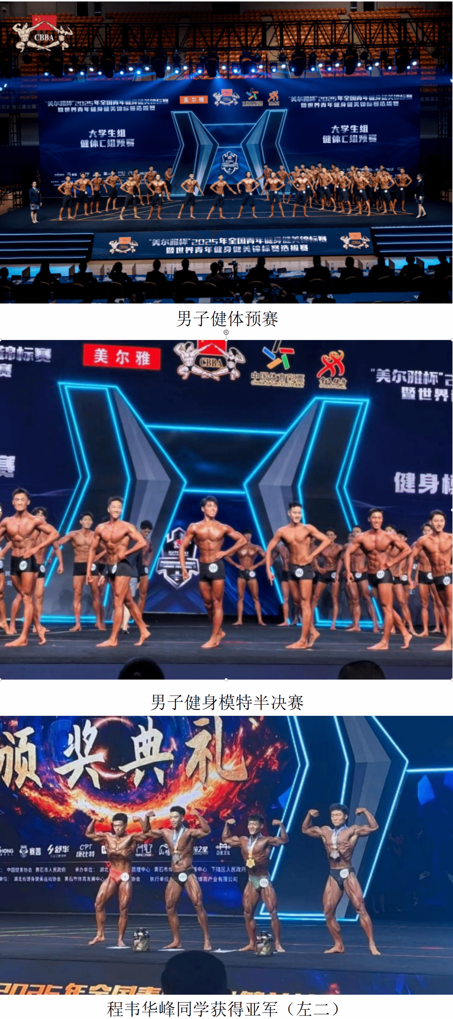 黄石鏖兵战鼓隆,青春健将展雄风。在2025年6月5日至9日于湖北省黄石市举办的全国青年健身健美锦标赛暨世界青年健身健美锦标赛选拔赛这一国家级竞技舞台上,bevictor伟德学子以卓越实力与坚韧姿态,谱写荣耀篇章。本次比赛汇聚了来自全国164个城市、74所院校、92支代表队的652名运动员,共同角逐老员工组与青年组20个项目的荣誉。公司代表队在领队郑传锋,教练员王丽君、朱轶凡的带领下,四名员工运动员孙啟耀(23级体育教育<师范)、郑凯文(23级体育教育)、程韦华峰(22 级运动训练)、董秀川(21级体育教育<师范)组队参赛。