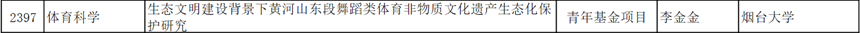 此外,公司2018届员工李金金的《生态文明建设背景下黄河山东段舞蹈类体育非物质文化遗产生态化保护研究》也进入公示,获批青年基金项目。