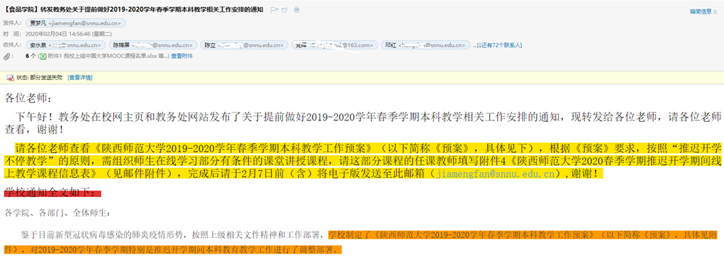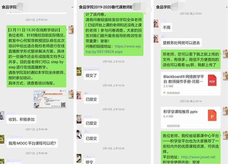 开展线上教学前,通过微信、qq群、邮件等形式,沟通讨论开学前的教学准备工作,向教师和员工及时传达公司的相关文件和重要精神,及时准确地填报各类开课信息表、教师拟采用的开课形式等信息,保证各类教学平台的顺利搭建,做好开课准备,帮助员工进入课程群。同时,耐心解答教师和员工关于延迟开学、远程上课等事宜的各种疑问,积极协调沟通,让员工在家也能安心学习,为教与学提供有效保障。新的模式给了我们新的挑战,最初建课时,每天从早到晚电话微信qq响个不停,有各种各样的问题,渐渐地在教务处、公司老师们和兄弟院系教学秘书的支持下,通过大家的共同努力,克服了种种困难,顺利展开线上教学。