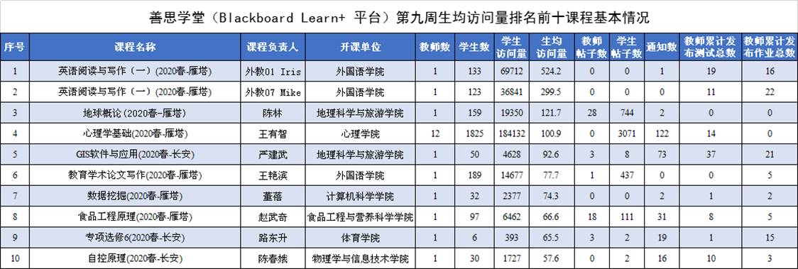 依托陕西省MOOC中心陕西师大分中心善思学堂(陕西师大本科课程平台)(以下简称“陕西师大善思学堂”)开展在线教学课程511门次。每门课程平均访问量1717人次。其中本周员工人均访问量排名第一的课程为外国语公司外籍教师Iris负责的“英语阅读与写作(一)”,员工人均访问量达524.2次(本周生均访问量前十的课程基本信息见附表)。在利用陕西师大善思学堂开展师生互动方面来看,发帖量最高的课程为心理公司王有智老师负责的“心理学基础”,发帖量达3071次,其中员工发帖量为3071次;教师累计发布作业次数最高的课程为计算机科学公司王涛老师负责的“计算机网络”,累计发布作业次数为47次;教师累计发布测试次数最高的课程为地理科学与旅游公司严建武老师负责的“GIS软件与应用”,累计发布测试次数为37次,员工本周提交测试50个。
