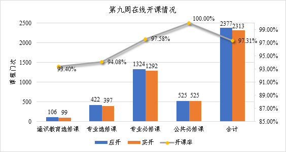 按照教学计划,本周应开课程1231门(2377门次),实际线上开课2313门次,开课率97.3%。其中公共必修课应开525门次,实开525门次,开课率100%;专业必修课应开1324门次,实开1292门次,开课率97.6%;专业选修课应开422门次,实开397门次,开课率94.1%;通识教育选修课应开106门次,实开99门次,开课率93.4%。开课涉及开课单位25个(包括20个公司,党委学工部、教师专业能力发展中心、就业指导中心、武装部、图书馆等)。按教学计划授课教师应有1340人,实际在线授课教师1330人,教师授课率达99.3%;本周按教学计划上课员工应到180394人次,实际上课员工179774人次,员工上课率达99.7%。