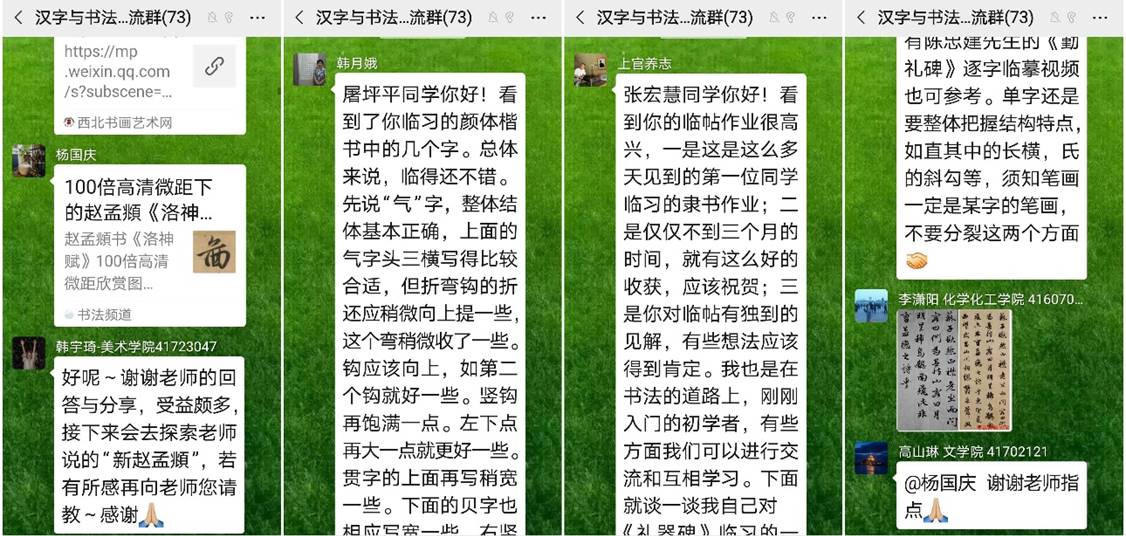 课程团队老师经常在微信群中分享书法理论知识及实践技巧,讲解不同字体的特点及精妙之处,同时同学们在群中分享自己的练习感受及作品,老师们针对提问及作品存在的问题进行耐心细致的指导,促进员工书法技能和理论水平的提升,热烈讨论帮助员工共同进步。