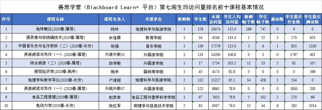 依托善思学堂(Blackboard Learn+平台)开展在线教学课程504门次。每门课程平均访问量1513人次。其中本周员工人均访问量排名第一的课程为地理科学与旅游公司陈林老师负责的“地球概论”,员工人均访问量达152.4次(本周生均访问量前十的课程基本信息见附表)。在利用善思学堂开展师生互动方面来看,发帖量最高的课程为地理科学与旅游公司陈林老师负责的“地球概论”,发帖量达1018次,其中员工发帖量为747次;教师发布作业次数最高的课程为化学化工公司李超群负责的“有机化学”,发布作业次数为4次;教师发布测试次数最高的课程为物理学与信息技术公司朱陆军负责的“普通物理”,发布测试次数为3次。