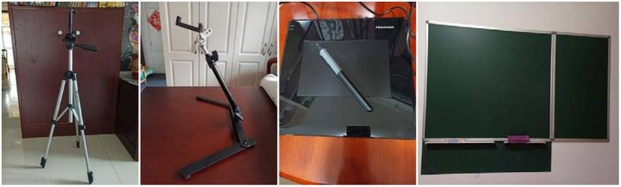 开学之初韩国栋老师身处老家,既要照顾年迈的父母,又没有在线教学设备,加之韩老师的眼睛曾多次做过手术,面对重重困难,韩老师没有退缩,他积极响应号召,立足本职,做好教学准备工作。为此,韩老师专门腾出一个房间用于教学,向亲戚借了一台电脑,又网购了打印机、三脚架、黑板粉笔、微课拍摄仪器、手机俯拍架以及写字板等一系列设备辅助教学。同时,韩老师从网盘里找到他所有的教学资料,因为视力很差,他不得不用较大号字体打印出来,便于使用。