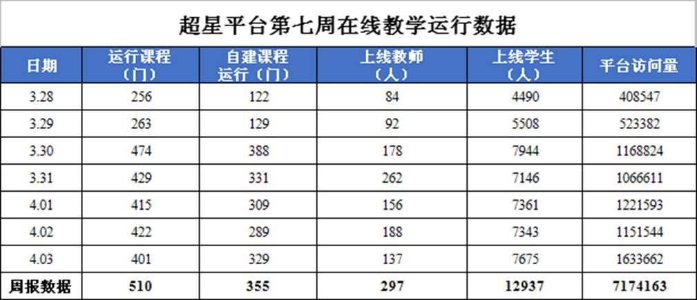 依托超星平台开展在线教学课程510门次课程,其中自建课程运行355门次,新建课程3门次。其中活跃课程290门,共有297位教师在线上开展教学,上线员工一共12937人,平台访问量7174163人次。本周运行班级727个,教师一共在线上发布了签到、问答、选人等405个课堂活动,发起课堂讨论262个,发布课后作业424个,教师在线上批阅作业1569个,11586个员工参与讨论并完成任务,4551人次完成了老师线上布置的作业。