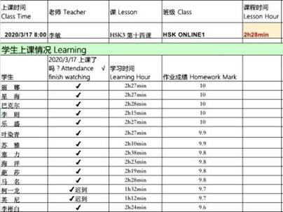 员工身在不同国家,教学管理相对困难。强化组教师通过钉钉线上班级群和微信原班级群“双管齐下”监督员工学习,对每一个员工、每一次课堂、每一份作业都详细记录并及时与职工管理办公室沟通,保证员工的到课率和学习效果。直播课前点名签到、直播课中随时点名检查员工学习情况,每堂课后,利用钉钉自动统计观看记录以及作业完成情况的功能,进行学习情况监控,并日日反馈。