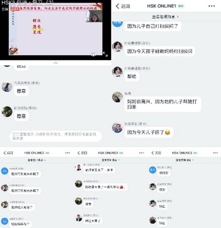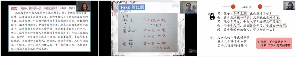 综合课老师李敏、曹捷、李晶、鱼茜和张释允每周一次集体备课,统筹安排,针对线上教学课件为主要呈现方式的特点,潜心完善PPT课件,通过富有逻辑的引导和内容组织将知识融合在一起,力求符合员工的认知和学习规律;汉语教学的目的在于培养员工的交际能力,教学将互动放在首位,教学过程中,利用生动图片等设置互动问题引导员工表达。员工克服了网络延迟、卡顿的问题,积极回答老师的提问、切实参与线上学习。