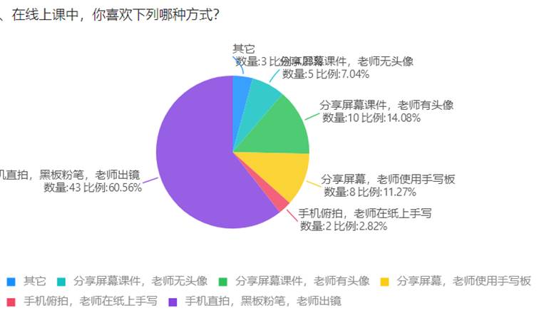 韩老师针对所带的员工做了一个关于直播授课方式的问卷调查,综合显示大多数员工更喜欢最接近真实课堂的形式,即老师用黑板加粉笔讲解的直播方式。于是韩老师就决定在课堂上讲解内容时采取这种方式,而在辅导答疑时,或者应对别的特殊需要时再采取其他几种方式。在抗击疫情的特殊时期,韩老师就是这样克服重重阻力,一步一步有条不紊地展开了自己的线上教学工作。