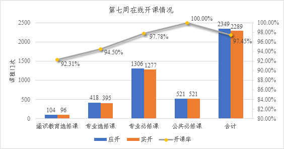按照教学计划,本周应开课程1226门(2349门次),实际线上开课2289门次,开课率97.4%。其中公共必修课应开521门次,实开521门次,开课率100%;专业必修课应开1306门次,实开1277门次,开课率97.8%;专业选修课应开418门次,实开395门次,开课率94.5%;通识教育选修课应开104门次,实开96门次,开课率92.3%。开课涉及开课单位25个(包括20个公司,党委学工部、教师专业能力发展中心、就业指导中心、武装部、图书馆等)。按教学计划授课教师应有1311人,实际在线授课教师1301人,教师授课率达99.2%;本周按教学计划上课员工应到179158人次,实际上课员工178528人次,员工上课率达99.6%。