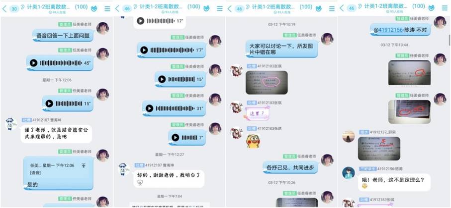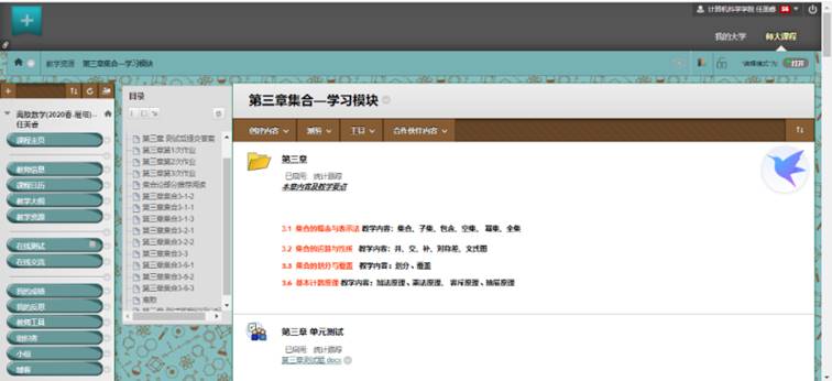 在授课模式上,任老师采用多种教学平台和智能工具相组合:以BB平台作为课程管理平台,通过该平台发布微课视频,布置课前预习、课后作业、单元测试,推荐拓展阅读材料以及讨论。以腾讯课堂作为课程直播平台,嗨格式录屏大师作为微课录制工具,问卷星作为学情和学习反馈问卷调查工具,QQ群、微信群作为答疑、交流和发布通知平台。同时将教学内容、学习资源、学习任务、讨论互动内容等多种学习内容相组合;将形成性评价、多元评价和终结性评价等多种评价方式相组合,多措并举开展线上教学。微课视频会提前两周发布BB平台,便于员工预习和复习。由于离散数学的作业量比较大,每周都要留1-2次作业,每次作业近100本,任老师都会在BB平台上给每个同学认真批改,发现问题及时反馈,也会对员工的共性问题统一讲解,每次作业的答案也会通过QQ群发给员工,让他们就个性问题再做修改。对于重点章节都会在BB平台上发布单元测试,让员工通过测试发现不足,查缺补漏。