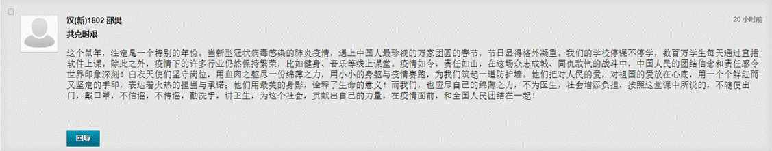 历史文化公司 家处湖北的2016级历史学创新实验班员工雷雨生的肺腑之言:这是一堂很特别也很有启发的思政课,在这样一个历史性的时刻,四位重量级讲者的分享也启发我去记录身边正在发生的历史、面对我们共同经历的时代、反思进步前行的经验。正如几位讲者所说的那样,面对这场突如其来的大疫,我们从一声声“山川异域,风月同天”、一次次公义的国际援助中更加深刻地体会到全球命运共同体的意涵;也从高效率的工程建设、物资配给、社区管理等方面进一步感受社会主义制度的优越性和祖国的强盛;更从前线活跃着的年轻身影中坚定了对这片土地未来的希望。这个假期,待在湖北家中,每天牵挂着关于疫情的最新消息,为了一点点好的进展而欢欣鼓舞,也从最初的恐惧与焦虑中看到光明与希望。也许正因为身在湖北,感同身受着大国的担当、生命的坚韧,我相信这场大疫将在我身上留下更加深刻而难以磨灭的印迹,启迪我用信念、热爱和奋斗去追寻美好的价值,去创造生命的意义。就像鲁迅先生在《我之节烈观》中所写的那样:“我们还要发愿:要自己和别人,都纯洁聪明勇猛向上;要人类都受正当的幸福。”