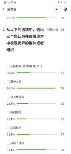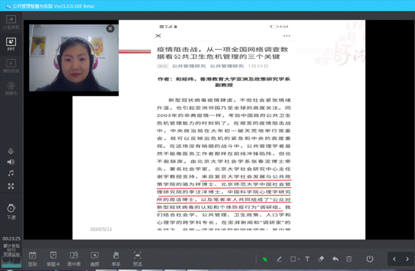 第一节课刘佳老师就把抗击“冠状病毒肺炎疫情”议题融入到直播授课教学中,介绍疫情期间公共管理学者做的研究和调查成果,剖析公共管理学者的研究如何有效推进一线抗疫活动,让员工们主动去思考公共管理在抗疫活动中的作用,体会和理解公共管理的学科使命和情怀。为提升员工热点议题讨论参与度,我还专门设计三道投票题,通过投屏把员工们选择的答案实时直播公开,不仅提升了员工的参与兴趣,也有效促进了师生间的互动,更好地引导员工进一步的思考。