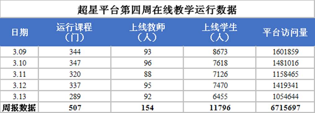 依托超星平台开展在线教学课程507门课程,其中自建课程运行411门,峰值出现在本周二,当天就有347门课程在教学平台上运行,开展教学活动。本周共上线教师154人,上线员工11796人,平台的访问量达6715697人次。本周新建课程3门,运行班级723个,发放课堂活动8000余次,师生讨论7861个。