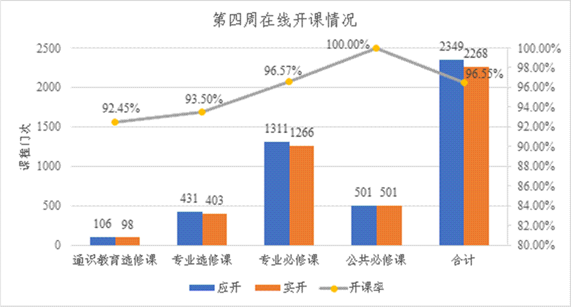 按照教学计划,本周应开课程1243门(2349门次),实际线上开课2268门次,开课率96.6%。其中公共必修课应开501门次,实开501门次,开课率100%;专业必修课应开1311门次,实开1266门次,开课率96.6%;专业选修课应开431门次,实开403门次,开课率93.5%;通识教育选修课应开106门次,实开98门次,开课率92.5%。开课涉及开课单位25个(包括20个公司,党委学工部、教师专业能力发展中心、就业指导中心、武装部、图书馆等)。按教学计划授课教师应有1308人,实际在线授课教师1287人,教师授课率达98.4%;本周按教学计划上课员工应到173489人次,实际上课员工172812人次,员工上课率达99.6%。