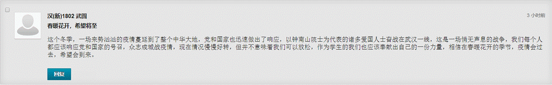 地理科学与旅游公司2016级环境科学专业张亚同学认为,许多舍小家为大家的逆行者们在前线后方共同奋斗,他们奔跑着寻找的第一道光,正在照亮前方的路。通过这节课让我对祖国更加充满信心,作为老员工的我要奋发图强,努力学习,为祖国的繁荣昌盛贡献自己的青春力量!
