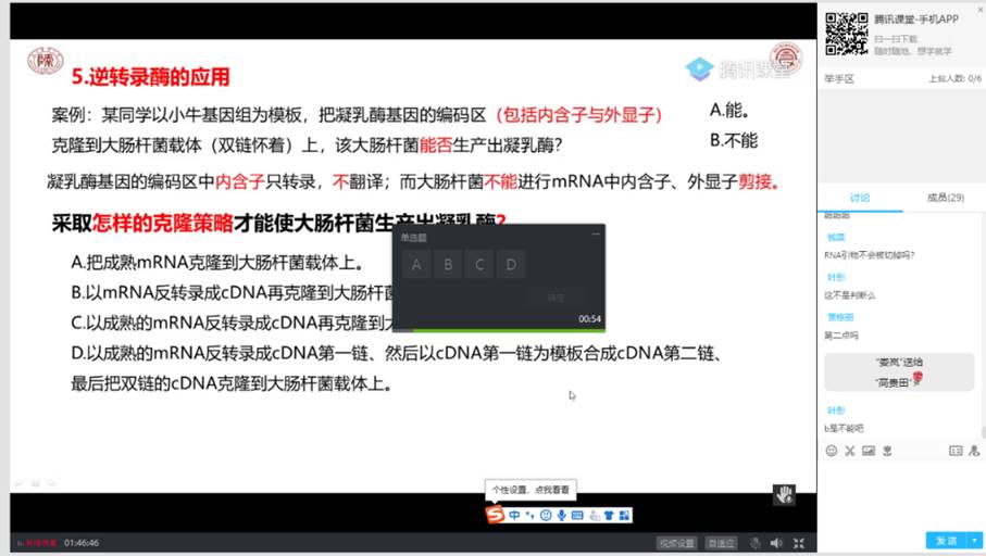 在线直播教学过程中,充分利用腾讯课堂答题卡功能,对教学重点、难点进行讨论,如在讲述逆转录酶的应用中设计问题“采取怎样的克隆策略才能使大肠杆菌生产出凝乳酶?”